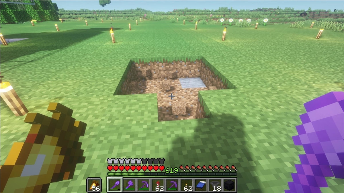 まず、3×3の四角形の穴を掘ります。穴の深さは1マスでOKです。