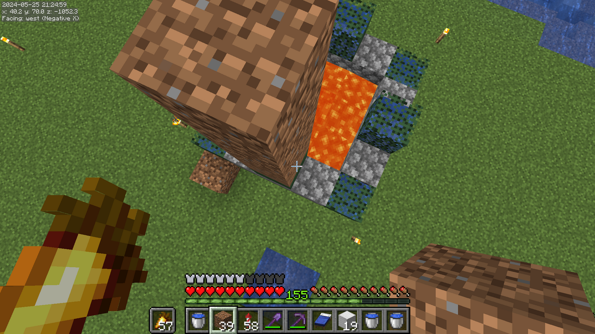 溶岩のほうに向かって建築ブロックをもう1個追加で設置します。