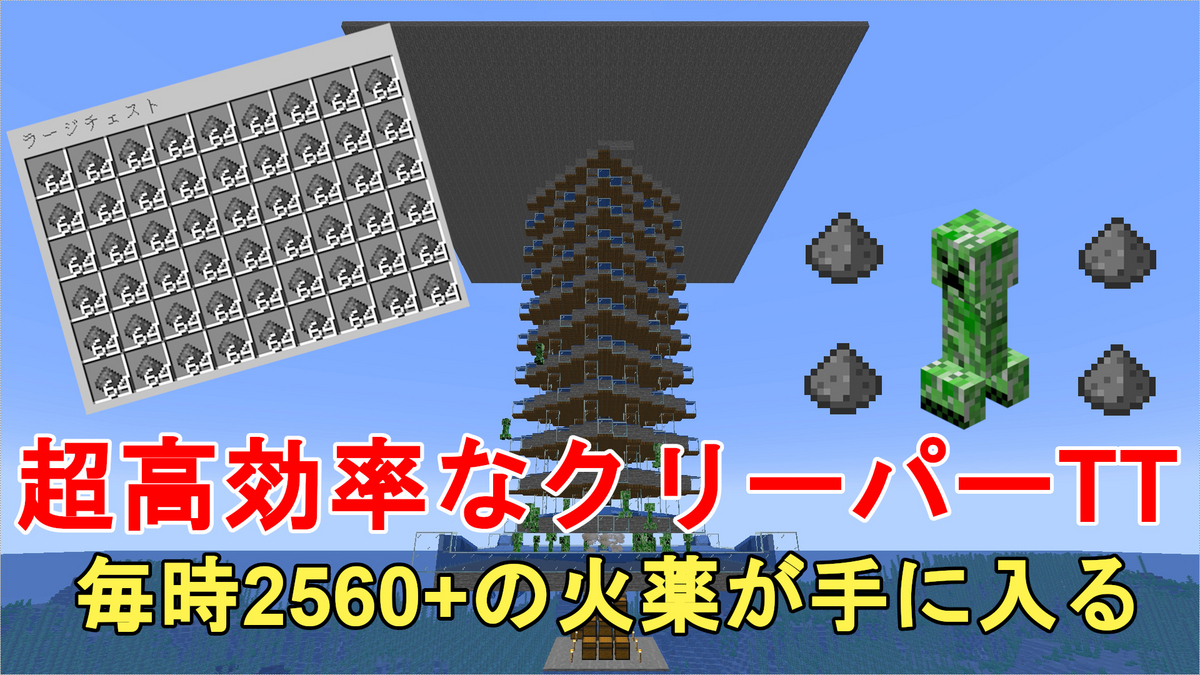 文章じゃなくて動画で解説を見たいという方は下記の動画を参考にしてください。誰でも簡単に作れて毎時平均2560+の火薬が手に入る超高効率なクリーパーTTの作り方を、動画でわかりやすく解説しています。