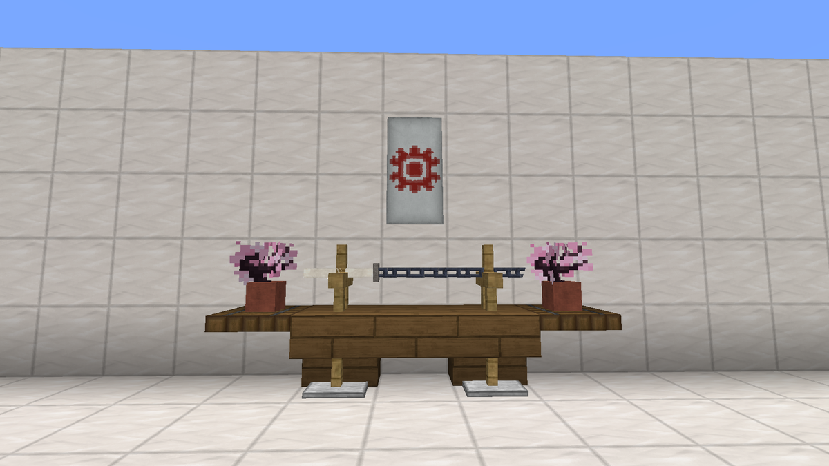 あとは壁に旗や絵画を設置して、刀完成です!花の模様を使って白い旗と赤い染料を使えばこの旗にできます。日輪のイメージ。