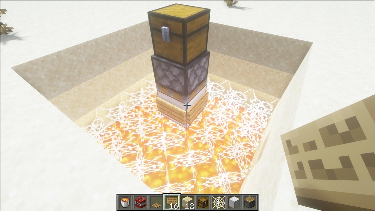 トラップチェストを開けると砂が崩れてクモの巣に絡まり溶岩に焼かれます。地獄絵図笑